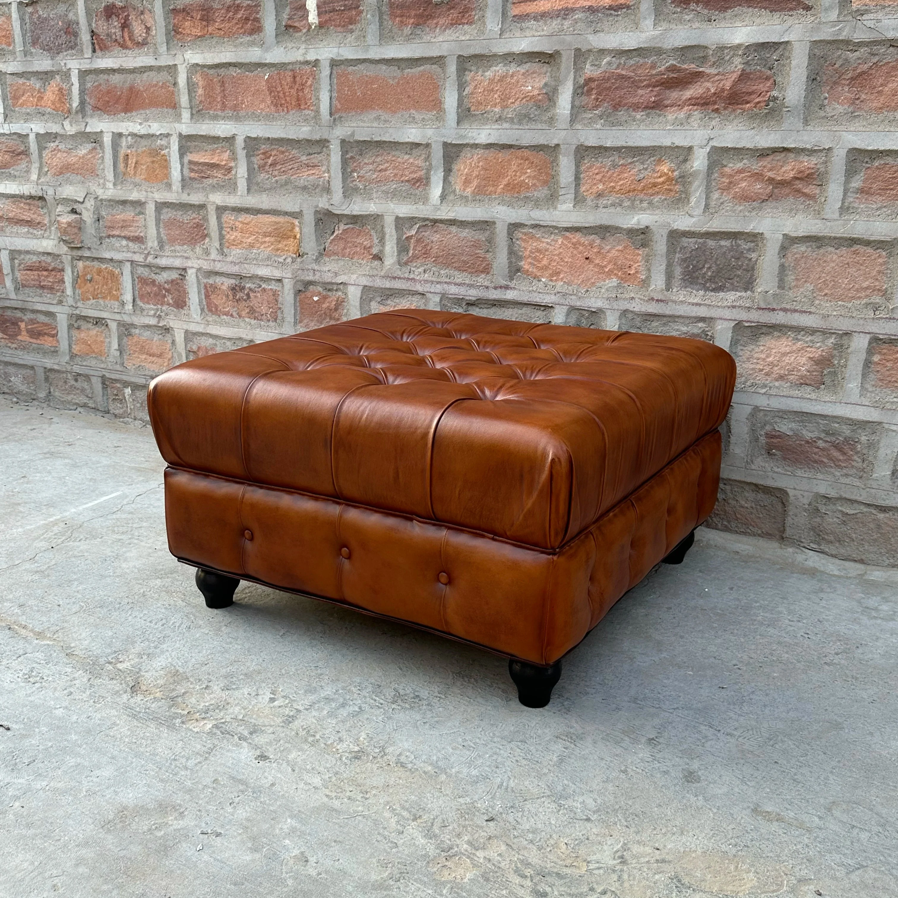 The Laramie Chesterfield Leather Ottoman is made to order from the finest quality, buffalo brown top-grain leather that we dye in-house ourselves. Please see the "Materials & Construction" section below for further details.