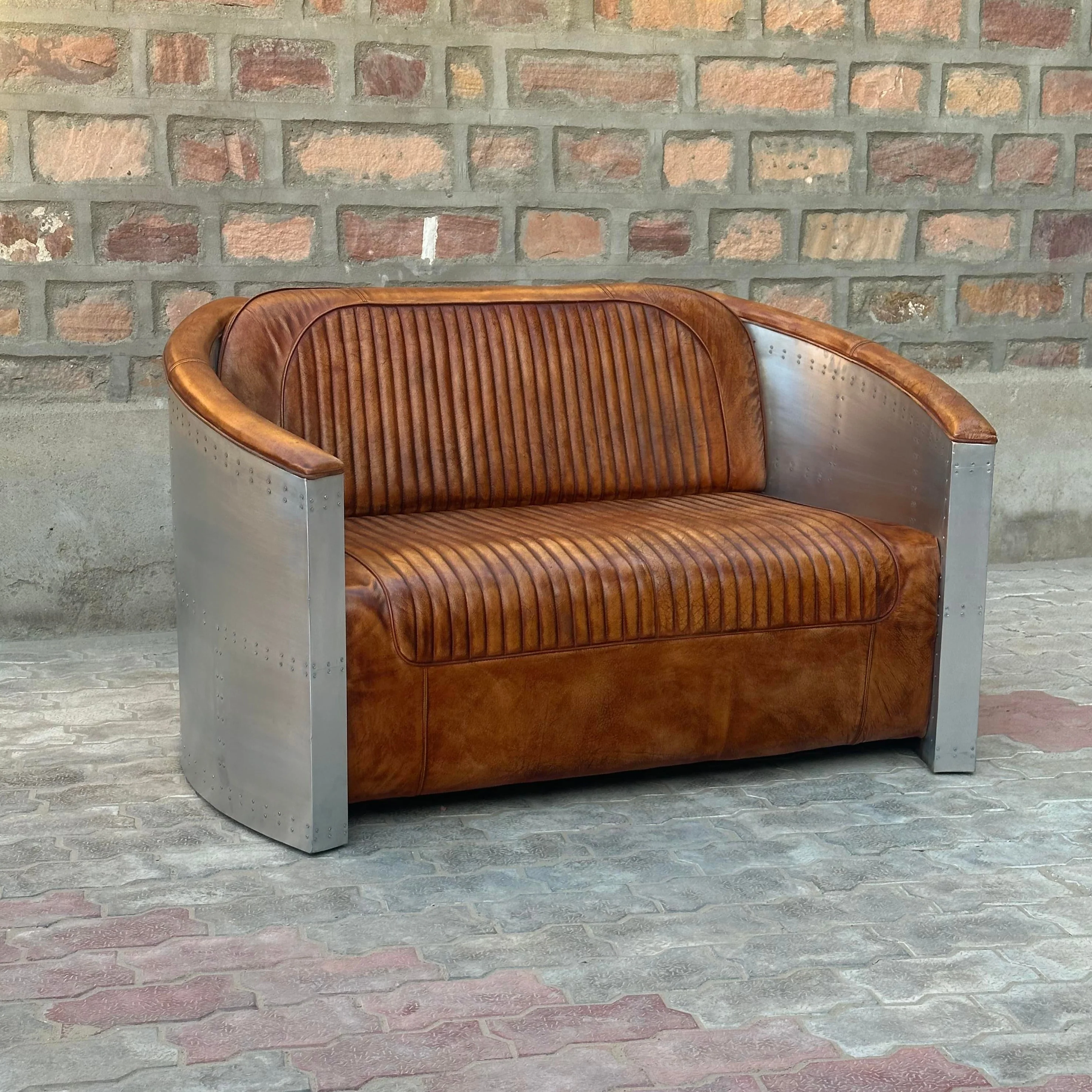 Designed to bring out the inner maverick that lives in all of us, our Top Gun Aviator Leather Loveseats are made of authentic top-grain leather and aluminum wrapped by hand around a solid wood frame. Please note that due to this hand-crafted nature and the thin aluminum, slight blemishes and imperfections are to be expected on our Aviator furniture.